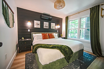The King bedroom includes artisan décor, a full-length mirror, and mini-split climate control. The cozy loft bedroom features forest-inspired wallpaper, river views, loveseat, writer’s desk with leather chair, and a projection screen for movie nights. The bathroom has a shower/tub combo stocked with Essential Oils toiletries.