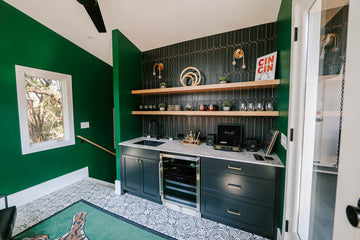 - Glassware for your favorite cocktails are located on the bar shelves