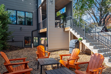 Relax on the rooftop with skyline views, wet bar, record player, dining for 8, firepit, bed swing, and copper soaking tub. The lower unit offers a covered porch and fenced backyard with grill + Adirondack chairs under string lights.