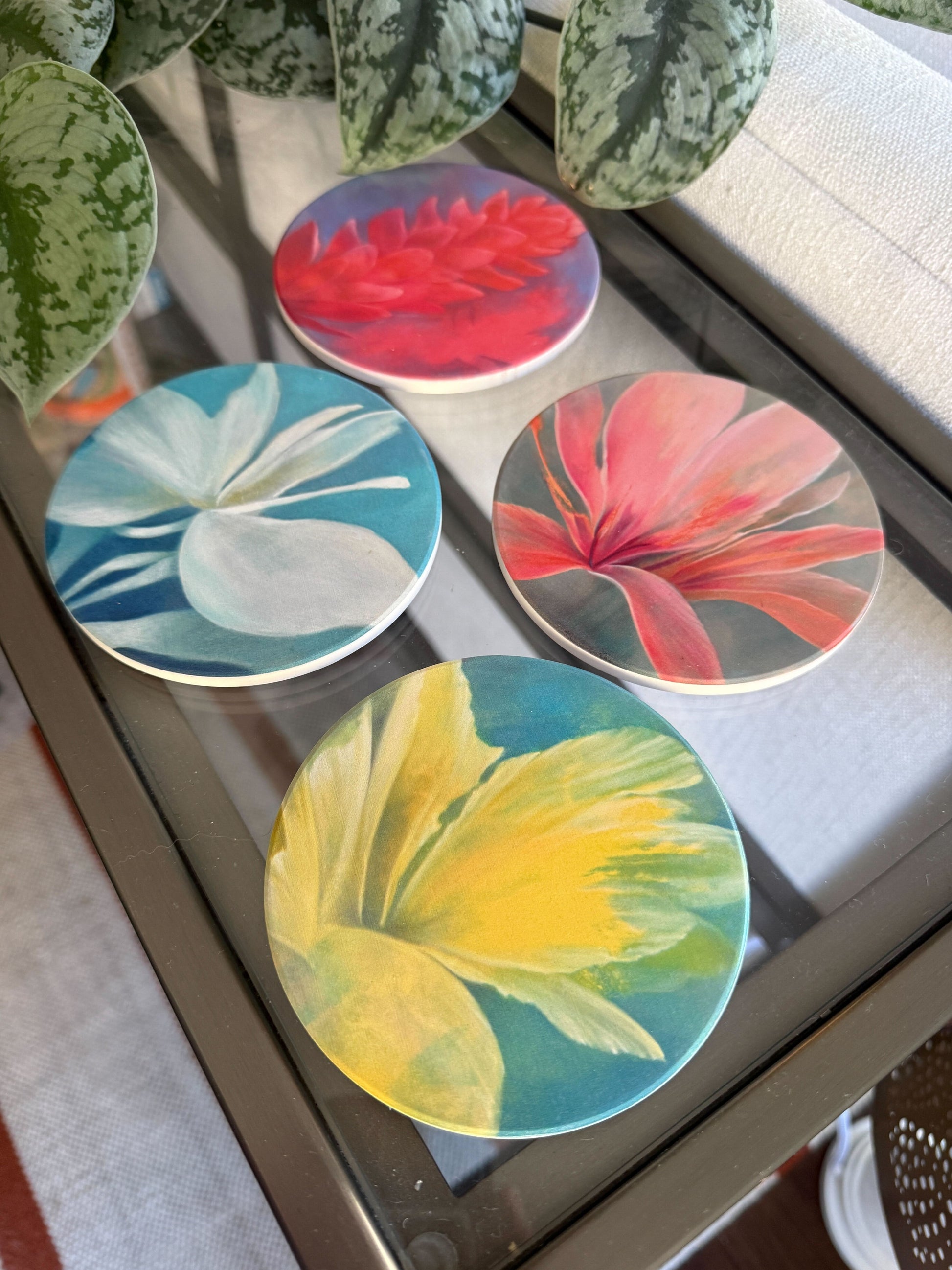 The smooth, modern circular design highlights the organic flow of each flower, creating a collection that feels cohesive yet uniquely expressive. Both functional and decorative, these coasters protect your surfaces while adding a refined pop of color to any space.